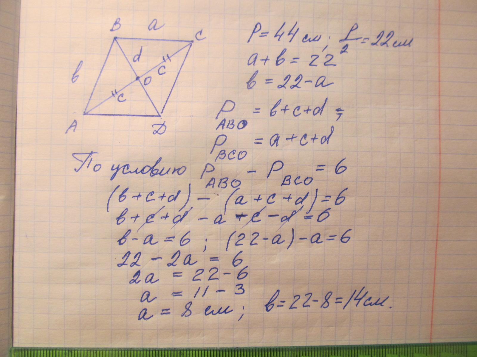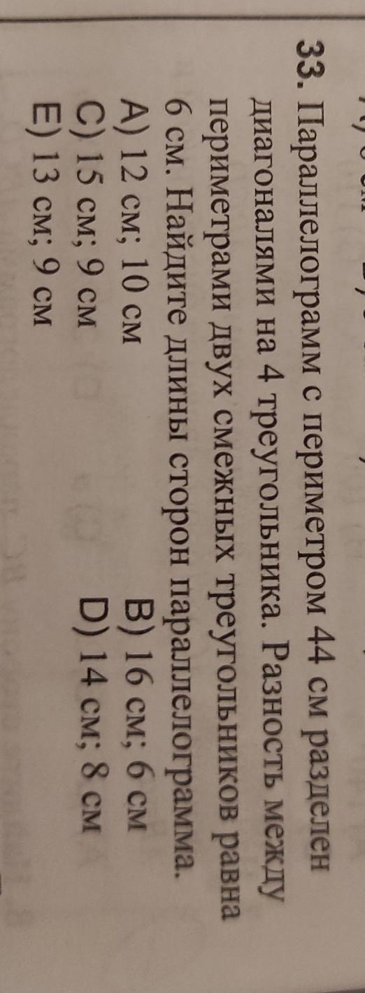 33. Параллелограмм с периметром 44 см разделен диагоналями на 4 треугольника. Разность между периметрами двух смежных треугольников равна 6 см. Найдите длины сторон параллелограмма. А) 12 см; 10 см B) 16 см; 6 см C) 15 см; 9 см D) 14 см; 8 см E) 13 см; 9 см