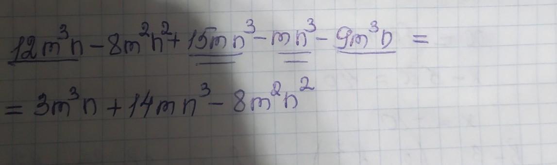 12m³n-8m²n²+15mn³-mn³-9m³n = 3m³n -8m²n²+14mn³