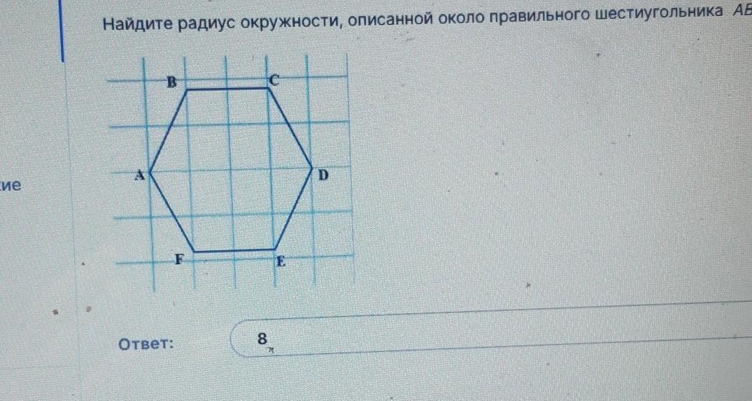 Найдите радиус окружности, описанной около правильного шестиугольника ABCDEF, считая стороны квадратных клеток равными 4.