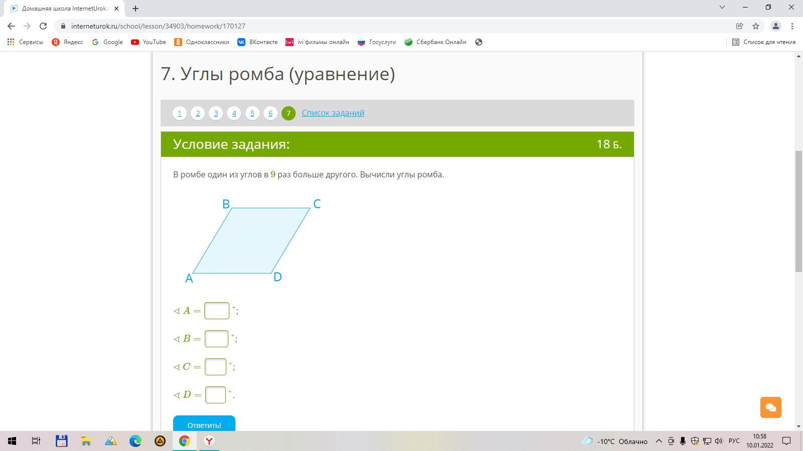 ∠А=∠С=18°; ∠В=∠D=9*18=162°