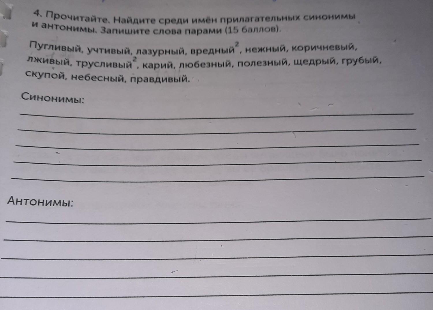 Синонимы: пугливый - трусливый, учтивый - любезный, лазурный - небесный, коричневый - карий