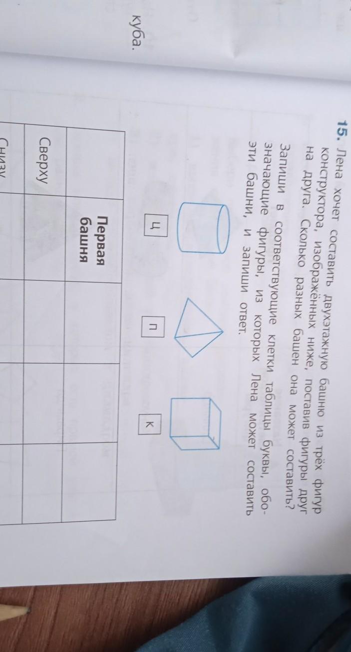 15. Лена хочет составить двухэтажную башню из трёх фигур Конструктора, изображённых ниже, поставив фигуры друг на друга. Сколько разных башен она может составить? Запиши в соответствующие клетки таблицы буквы, обо- значающие фигуры, из которых Лена может составить эти башни, и запиши ответ. Ц П K срочно нужно