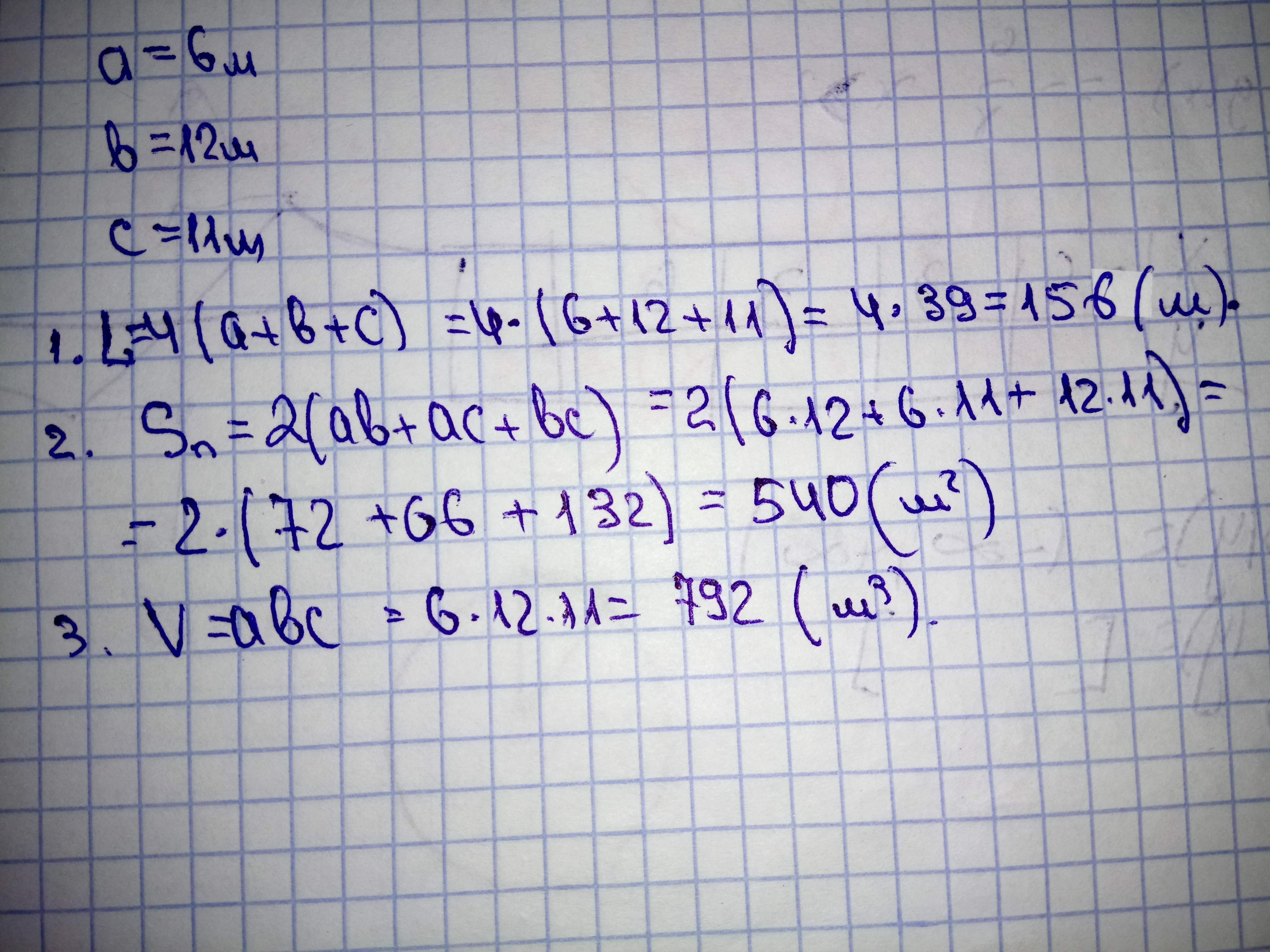 Виміри прямокутного паралелепіпеда дорівнюють 6 м,12м,11м.Знайти суму довжин всих ребер; площу повної поверхні та об'єм.