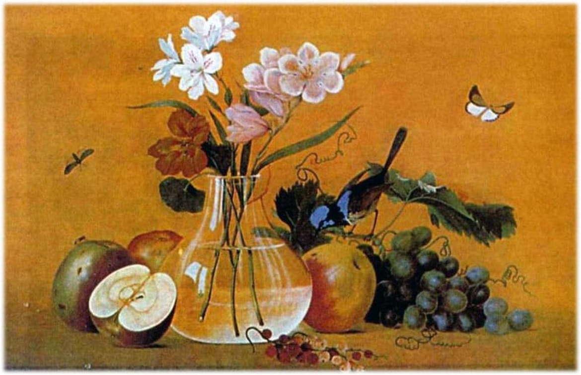 Передо мной живописная работа Ф.П. Толстого, больше известного в русском искусстве в качестве медальера или мозаичника. Его картина написана в жанре натюрморта, целью которого является работа с цветом и фактурой.