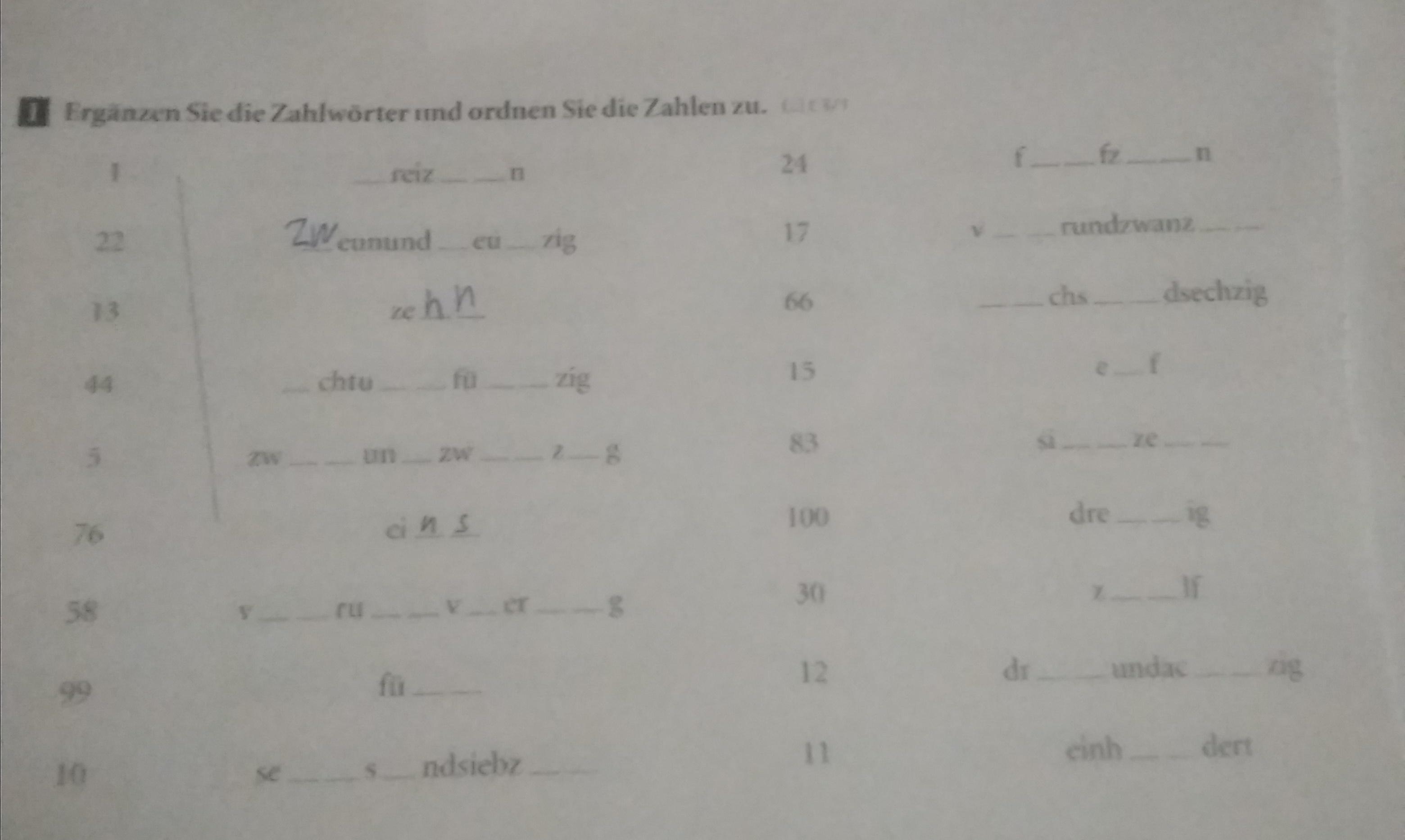 Erganzen Sie die Zahlwörter und orbnen Sie die Zahlen zu.