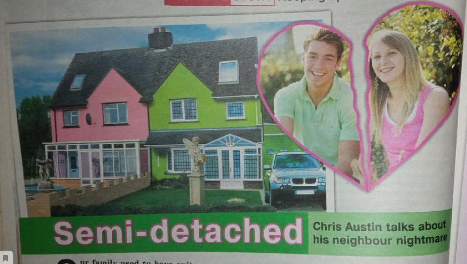 Chris's house has real problems because of his neighbour. His house willalwayse be compared to the person that lives naearby's house. His house isn't as elegant as his neighbour's house. Also, his neighbour has got nore expensive windows. We can't say whose house is larger, they are almost similar size. As we could see, the garden in Chris's house wasn't big. But if Chris gets the second part of this detached house, he will have the largest house in his town!