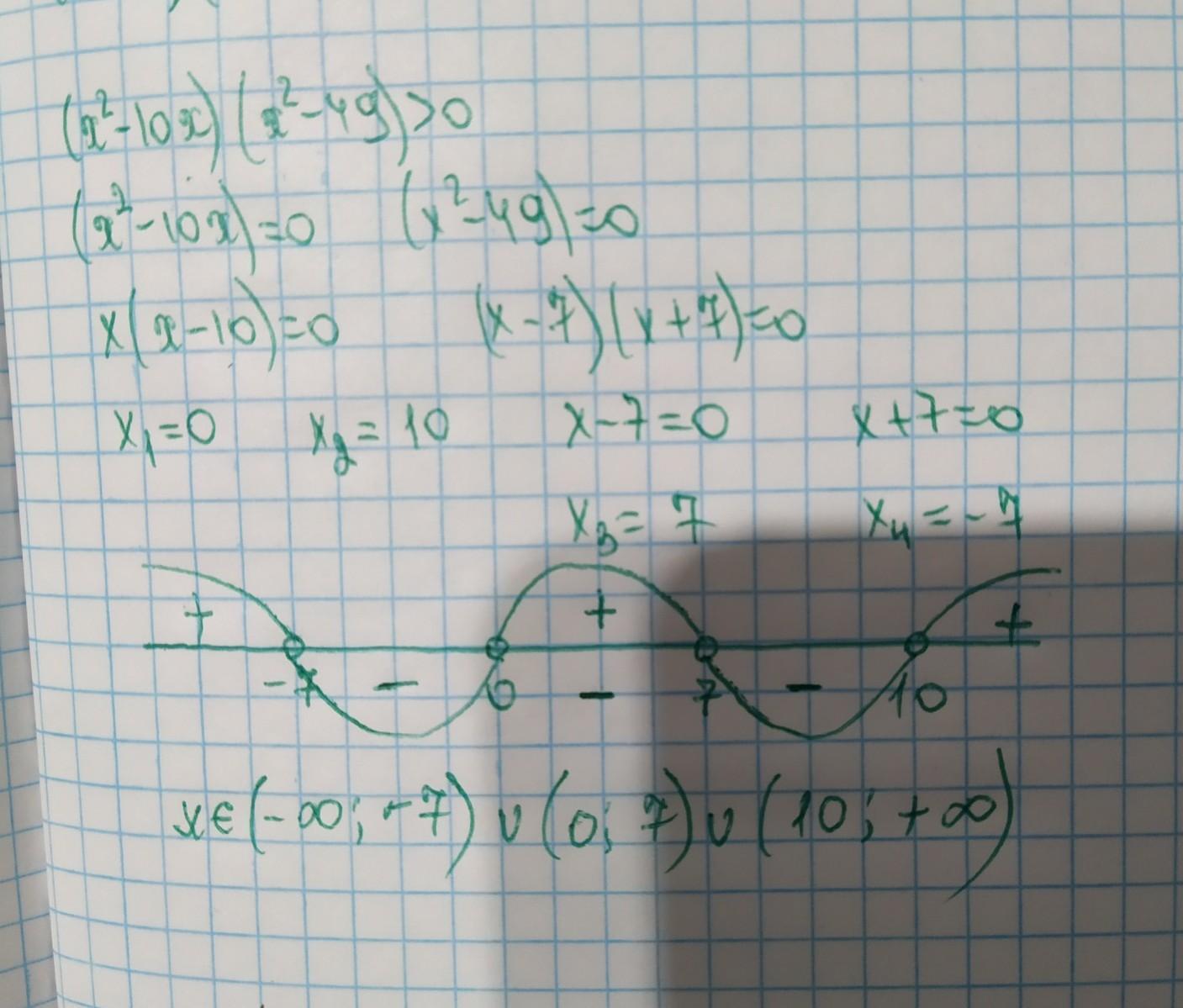 Ответ: x ∈ ⟨- ∞, -7 ⟩∪⟨ 0, 7 ⟩∪⟨10, +∞ ⟩