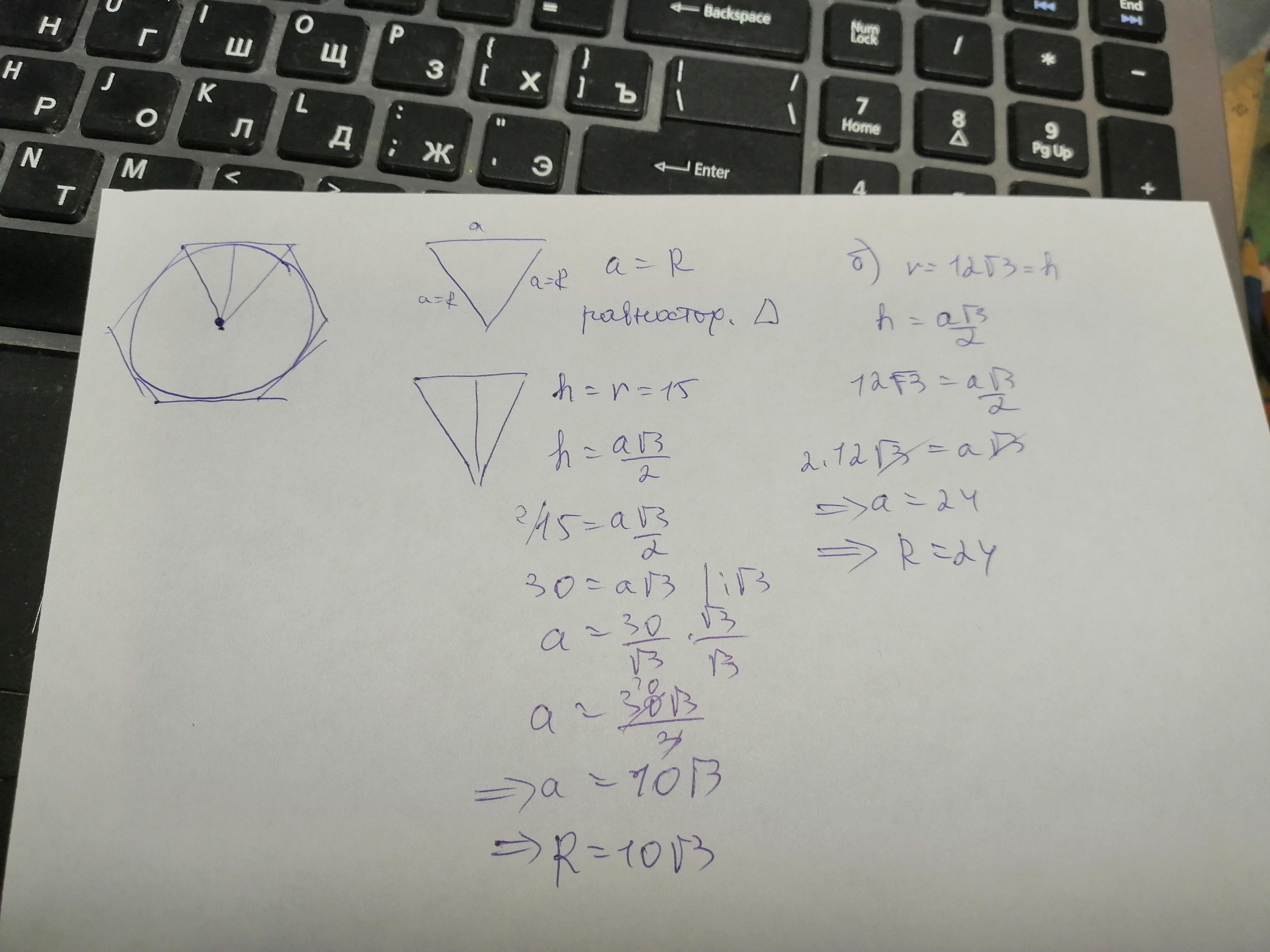 найдите сторону шестиугольника в радиус описанной окружности если радиус вписанной окружности равен а) 15 см
