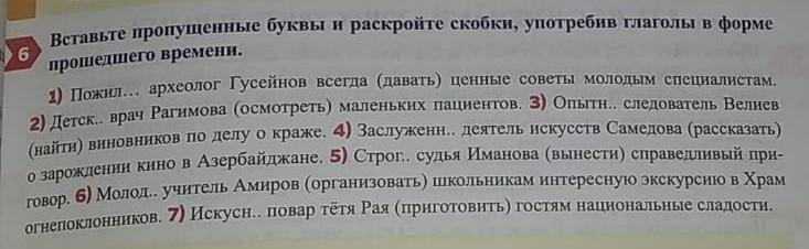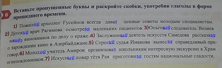 1) Пожилой археолог Гусейнов всегда давал ценные советы молодым специалистам. 2) Детский врач Рагимова осмотрела маленьких пациентов. 3) Опытный следователь Велиев нашёл виновников по делу о краже. 4) Заслуженный деятель искусств Самедова рассказала о зарождении кино в Азербайджане. 5) Строгая судья Иманова вынесла справедливый приговор. 6) Молодой учитель Амиров организовал школьникам интересную экскурсию в Храм огнепоклонников. 7) Искусный повар тётя Рая приготовила гостям национальные сладости.