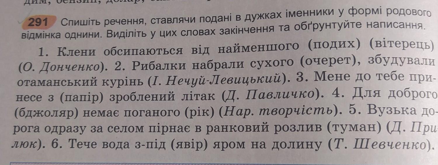 1. Клени обсипаються від найменшого (подих) (вітерець) . 2. Рибалки набрали сухого (очерет), збудували отаманський курінь (І. Нечуй-Левицький). 3. Мене до тебе при- несе з (папір) зроблений літак (Д. Павличко). 4. Для доброго (бджоляр) немає поганого (рік) (Нар. творчість). 5. Вузька до- рога одразу за селом пірнає в ранковий розлив (туман) (Д. При- люк). 6. Тече вода з-під (явір) яром на долину .