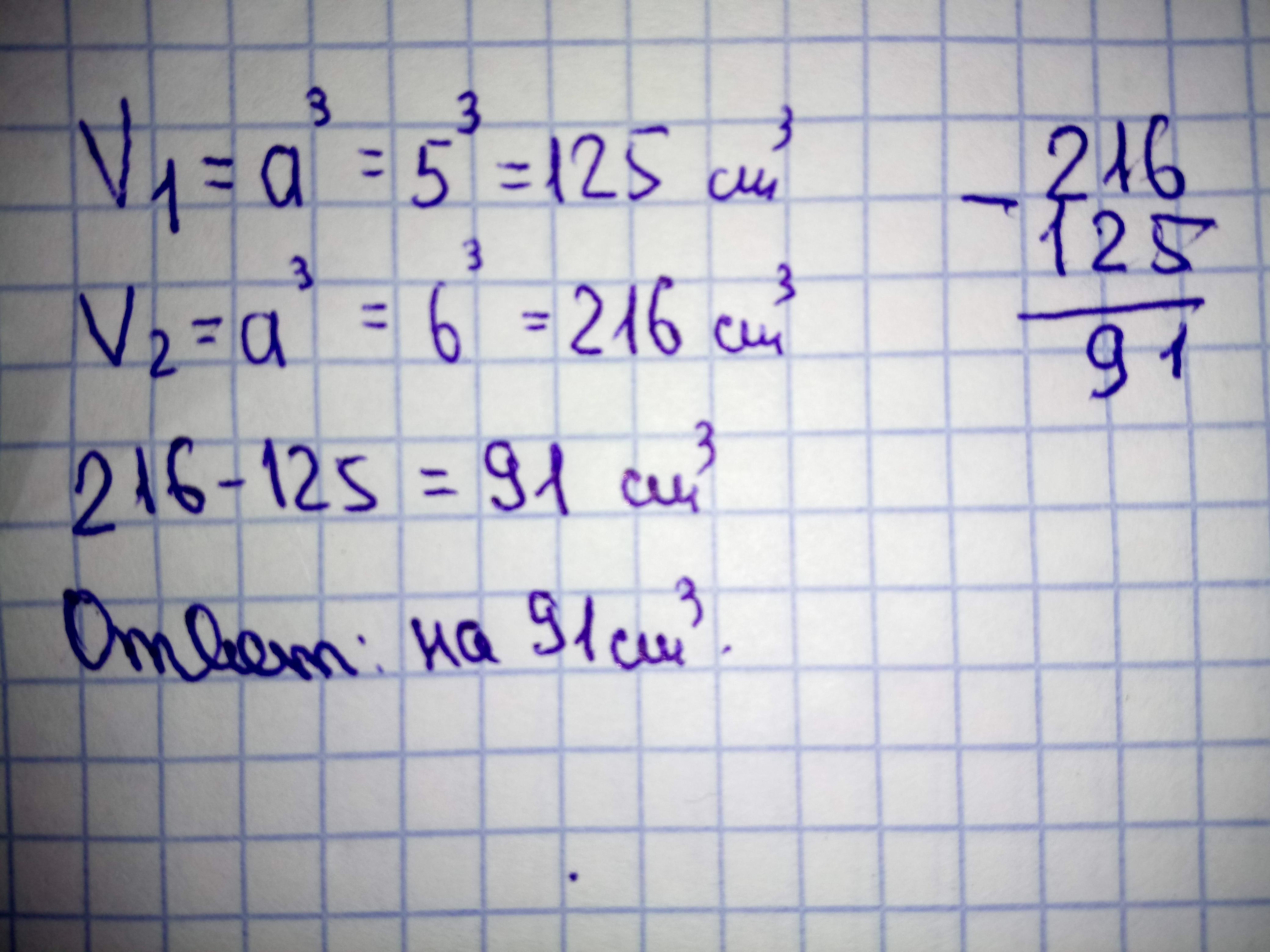 было 125см^3 стало 216см^3 => в поле ответа нужно выписать циферку 91.