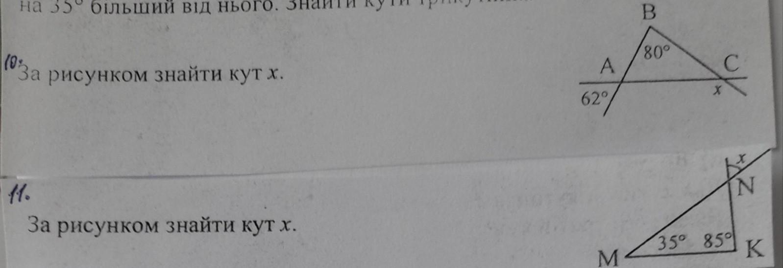 11 . ∠х = ∠MNK = 180° - ( 35° + 85° ) = 180° - 120° = 60° ( за власт. суми