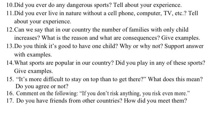 10. Занимались ли вы когда-нибудь опасными видами спорта? Расскажите о своем опыте. 11. Жили ли вы когда-нибудь на природе без мобильного телефона, компьютера, телевизора и т.п.? Расскажите о своем опыте. 12.Можно ли сказать, что в нашей стране увеличивается количество семей с единственным ребенком? В чем причина и каковы последствия? Приведи примеры. 13. Как вы думаете, хорошо ли иметь одного ребенка? Почему или почему нет? Подтвердите ответ примерами. 14. Какие виды спорта популярны в нашей стране? Вы занимались каким-либо из этих видов спорта? Приведи примеры. 15. «Удержаться на вершине труднее, чем добраться туда?» Что это значит? Вы согласны или нет? 16. Прокомментируйте следующее: «Если вы ничем не рискуете, вы рискуете еще больше». 17. У тебя есть друзья из других стран? Как вы с ними познакомились?
