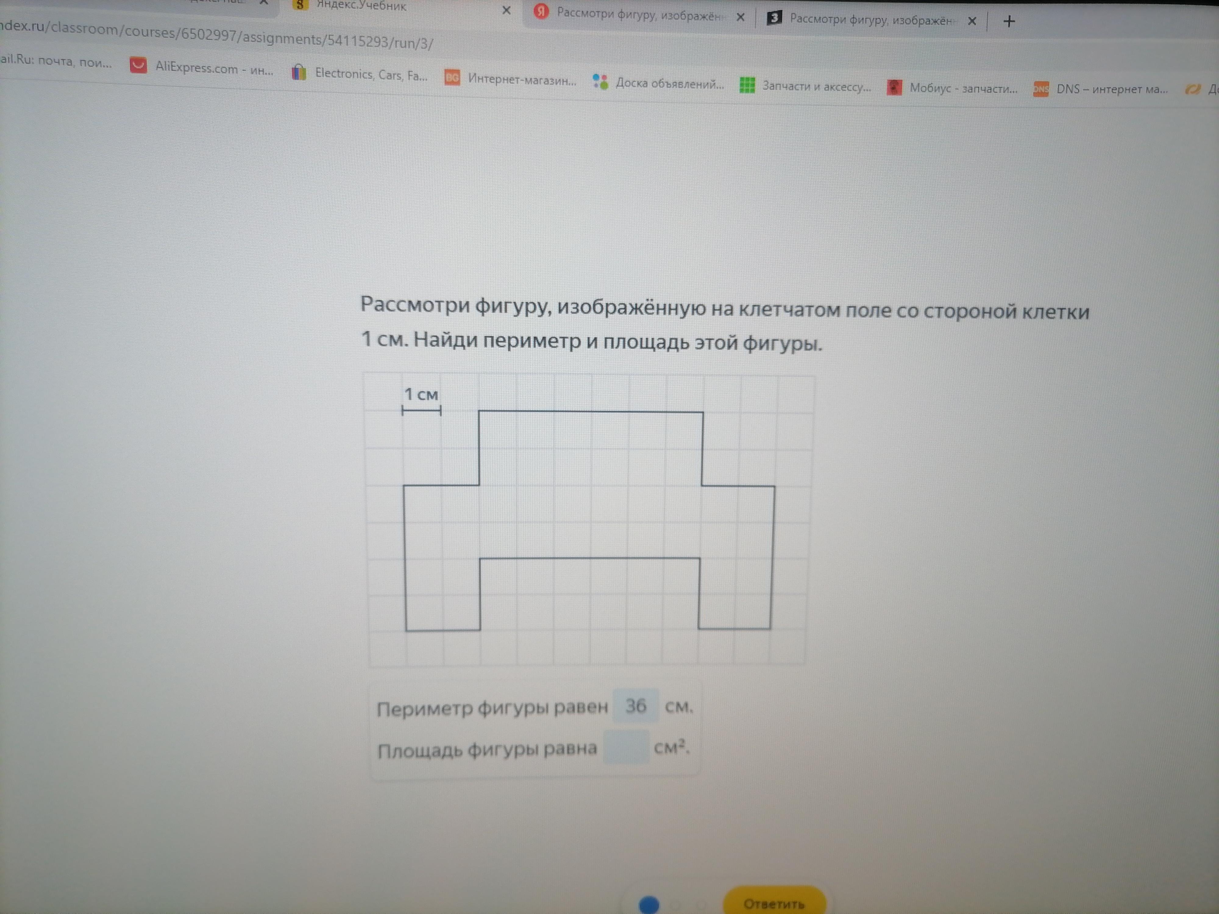 Фигура состоит из 40 клеток, каждая имеет площадь 1 см², значит, площадь фигуры 40 см².