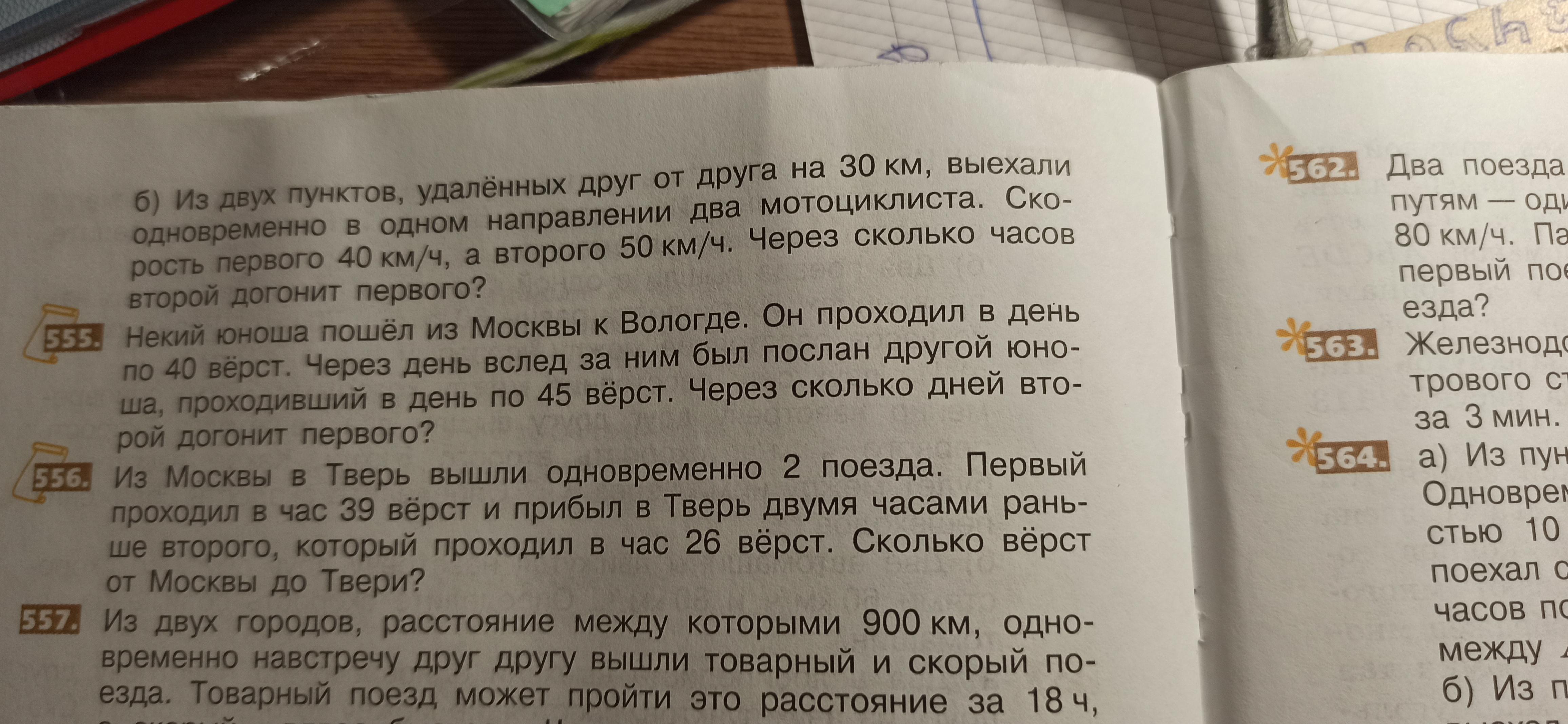 Задача 556: Из Москвы в Тверь вышли одновременно 2 поезда. Первый проходил в час 39 вёрст и прибыл в Тверь двумя часами раньше второго, который проходил в час 26 вёрст. Сколько вёрст от Москвы до Твери?