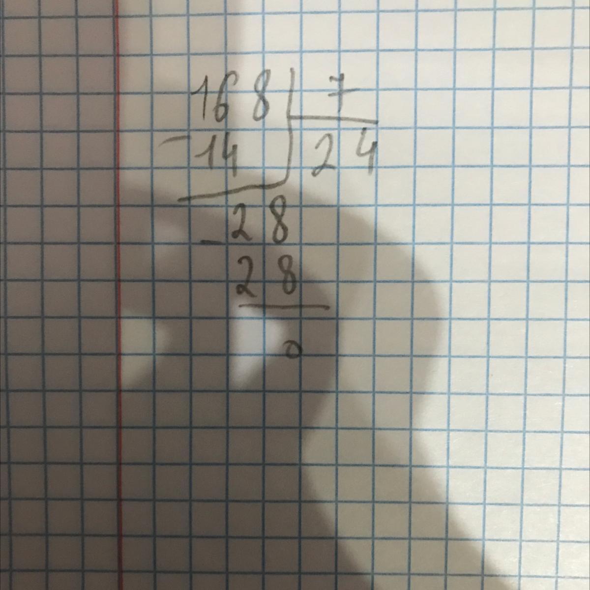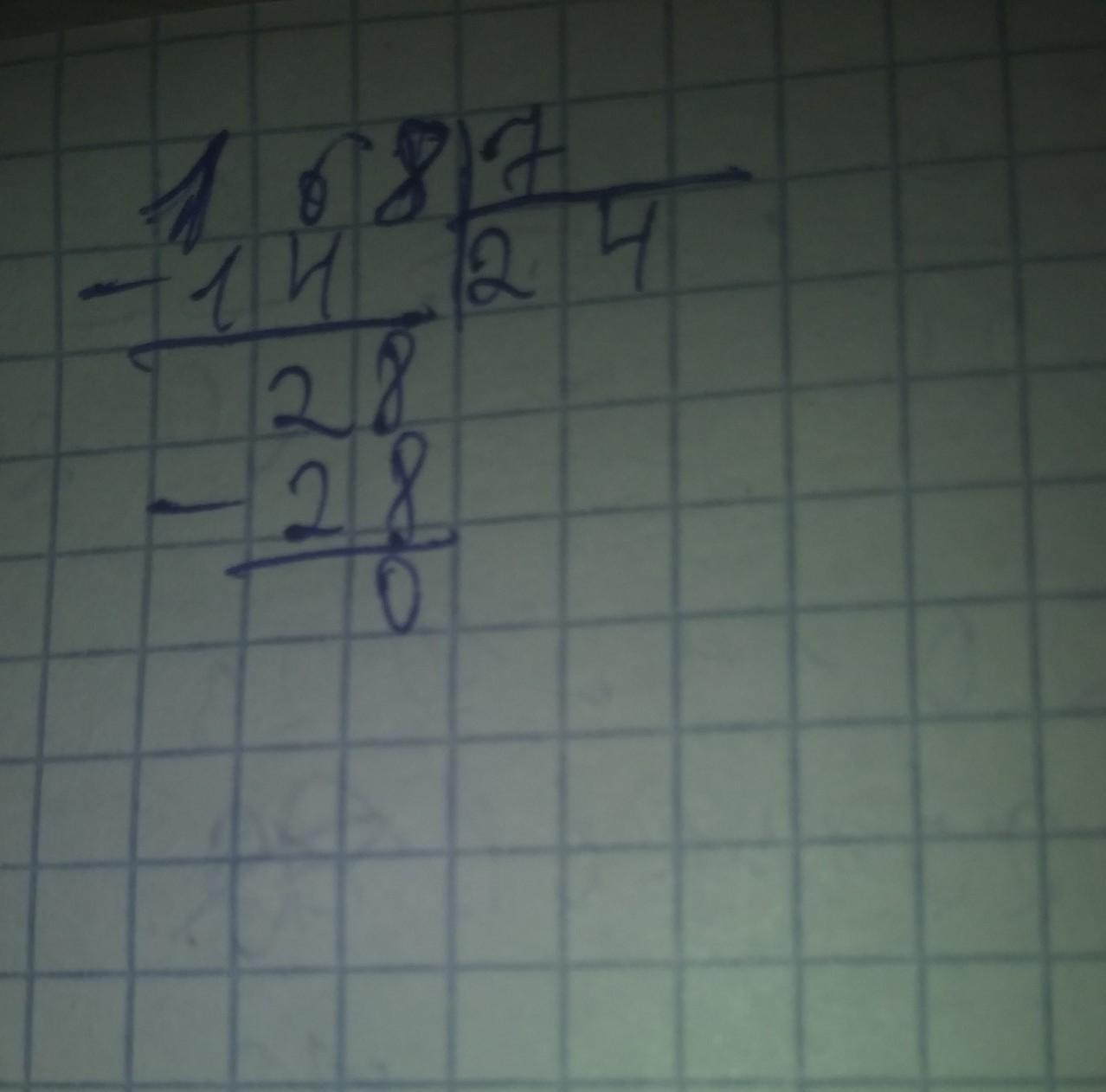 Сперва сделаем на столбик и 168 делим на 07:16 из 16 есть 07:02 7 × 2 14 и пишем тут под 16:14 и будет 16 - 14 2 и спускаем восемь и 7 × 4 будет 28 и пишем 28 снизу 20восьми и будет ноль