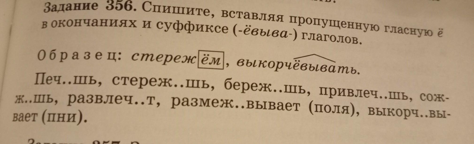 Печ/ёшь/, стереж/ёшь/, береж/ёшь/, привлеч/ёшь/, сожж/ёшь/, развлеч/ёт/, размеж/ёвыва^/ет (поля), выкорч/ёвыва^/ет (пни).
