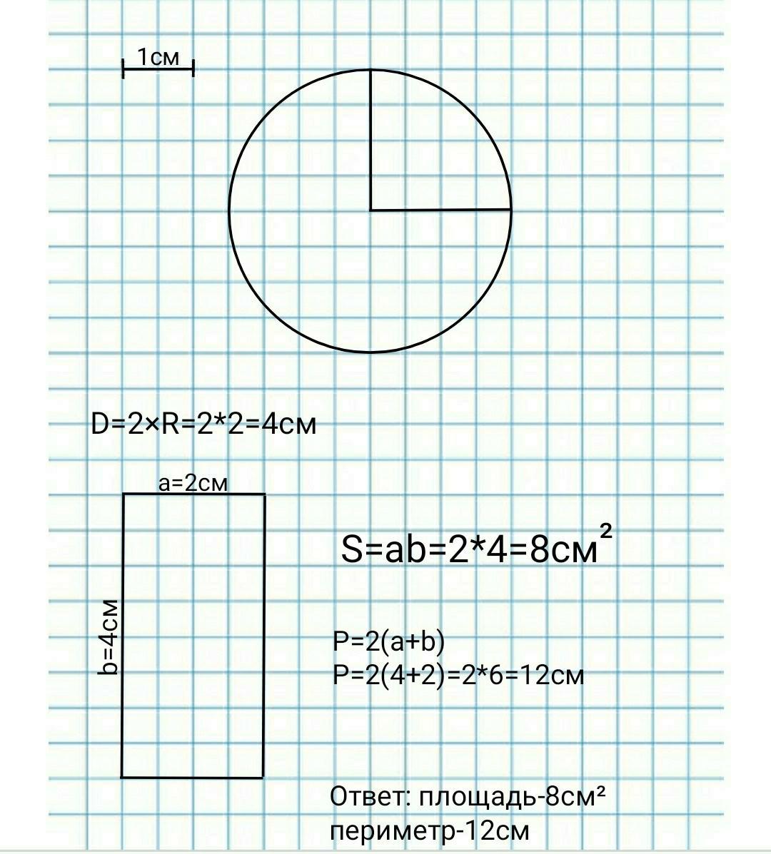 побудуй коло радіусом 2 см і прямокутник,довжина однієї сторони якого дорівнює радіусу,а другої-діаметру.Знайди площу і периметр прямокутника.