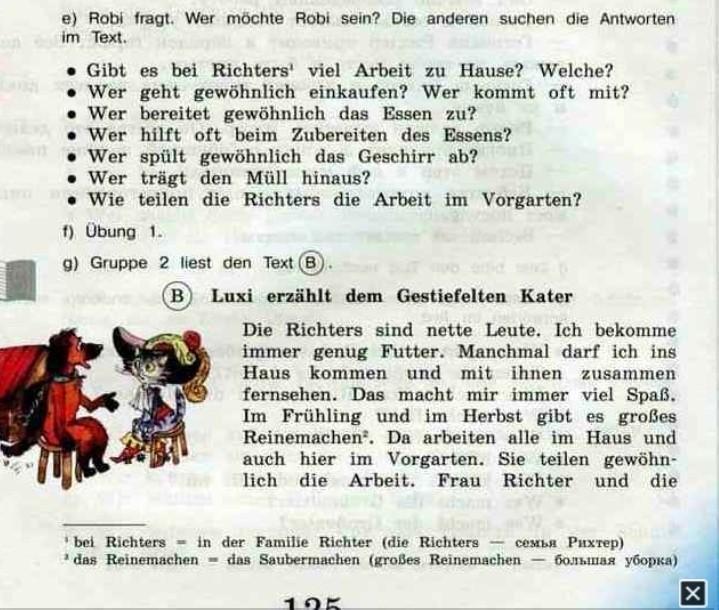 1. Ja, bei Richters gibt es viel Arbeit zu Hause. Im Fr+hling und im Herbst bringen sie das Haus in Ordnung. Im Vorgarten haben sie auch viel zu tun. Sie putzen die Fenster und die Treppe, der Vater macht Ordnung in der Garage.