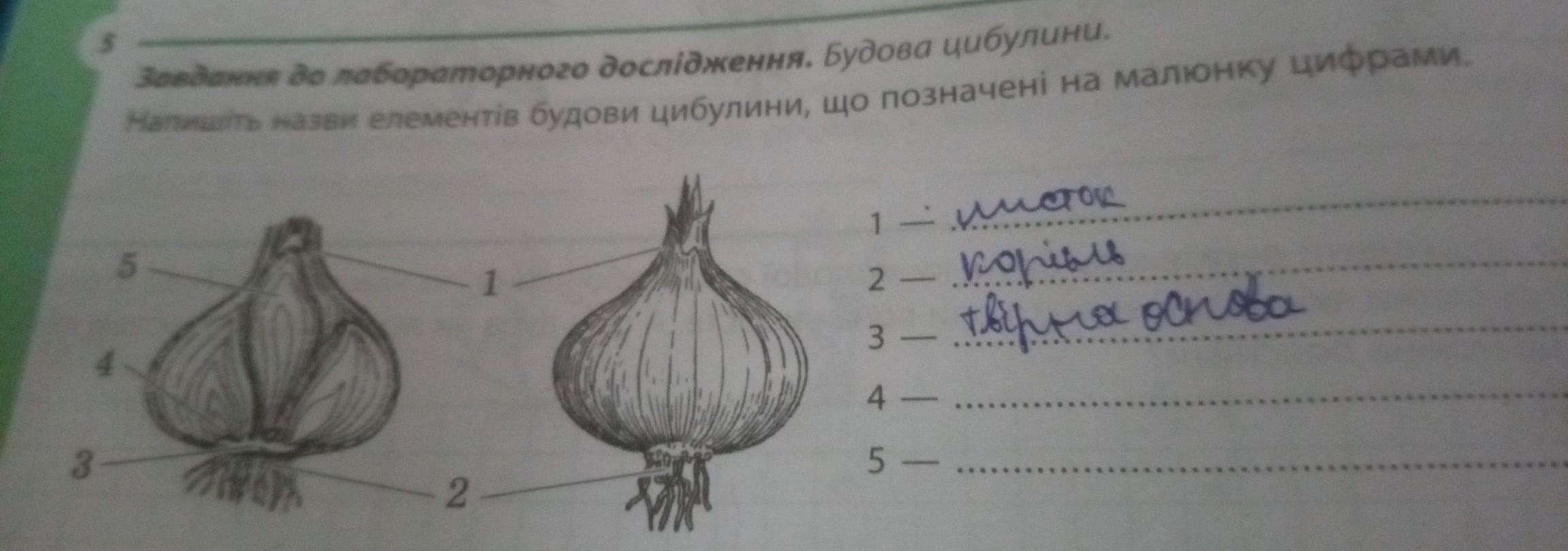 Будова цибулини. Напишить назви елементив будови цибулини, що позначени на малюнку цифрами