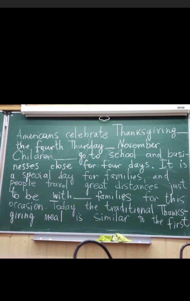 Americans celebrate thanksgiving in the fourth thursday of november. children don't go to school and businesses close for four days. it is a special day for families, and people travle great distances just to be with their families for this occasion. today the traditional thanksgiving meal is similar to the first one they had nearly 400 years ago. people eat roast turkey with cranberry sauce, potatoes and pumpkin pie. many organisations also prepare a free meal for poor people in their towns or sities. in new york, there are also parades and more than two million people go to see it every year.