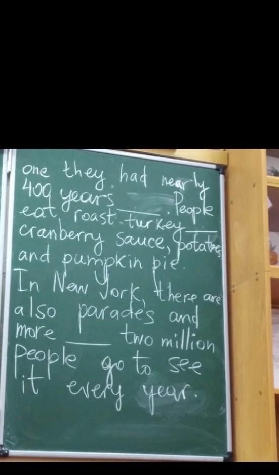 one they had nearly 400 years AGO. People eat roast turkey WITH cranberry sauce, potatoes and pumpkin pie. In New York, there are also parades and more THAN two million people go to see it every year.