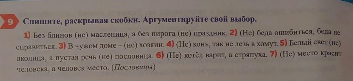 9 Спишите, раскрывая скобки. Аргументируйте свой выбор. 1) Без блинов (не) масленица, а без пирога (не) праздник. 2) (Не) беда ошибиться, беда не справиться. З) В чужом доме — (не) хозяин. 4) (Не) конь, так не лезь в хомут. 5) Белый свет (не) околица, а пустая речь (не) пословица. 6) (Не) котёл варит, а стряпуха. 7) (Не) место краси человека, а человек место. (Пословицы)
