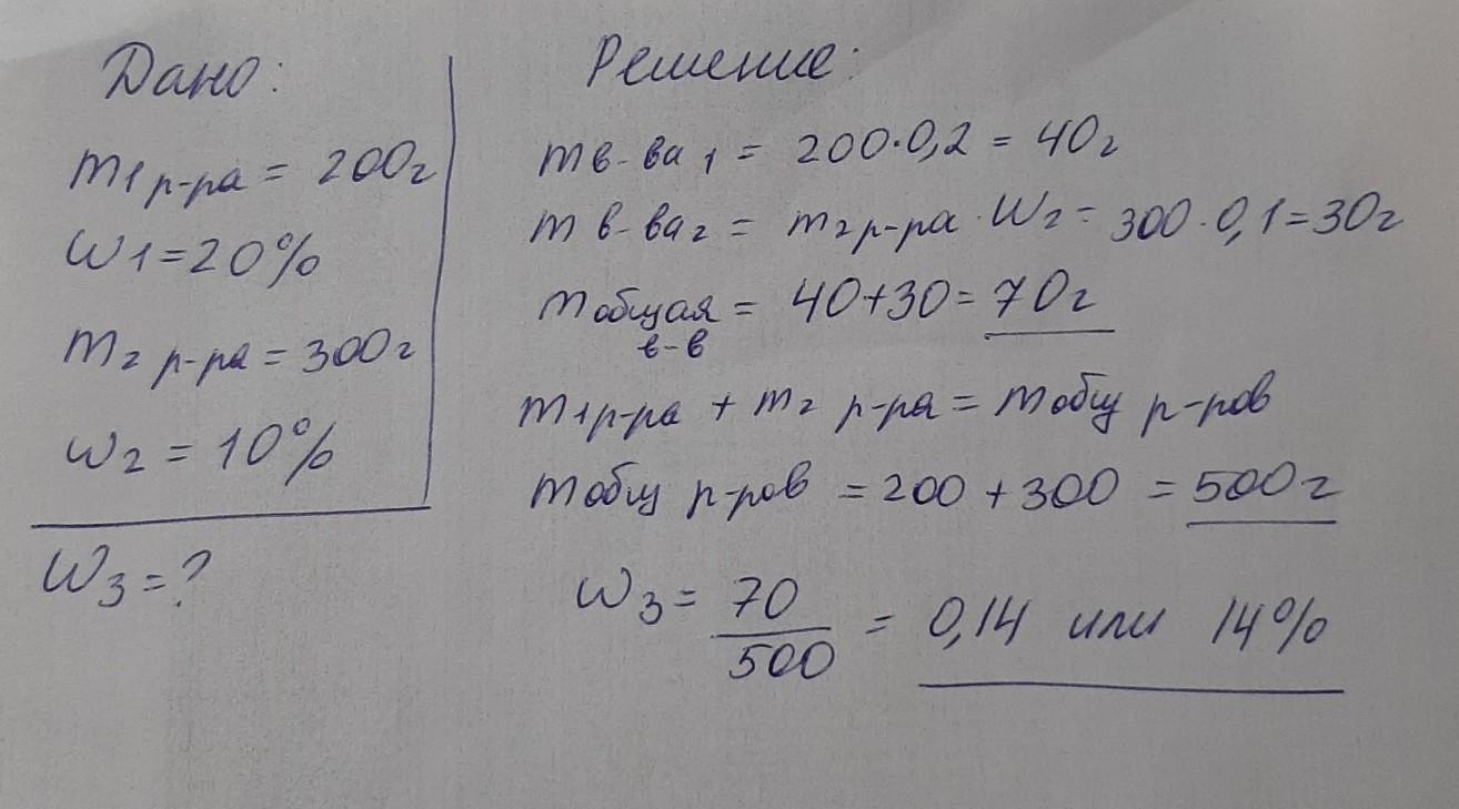 рассчитайте массовую долю вещества в растворе,которая образуется при сливании 200гр 20% и 300гр 10% раствора