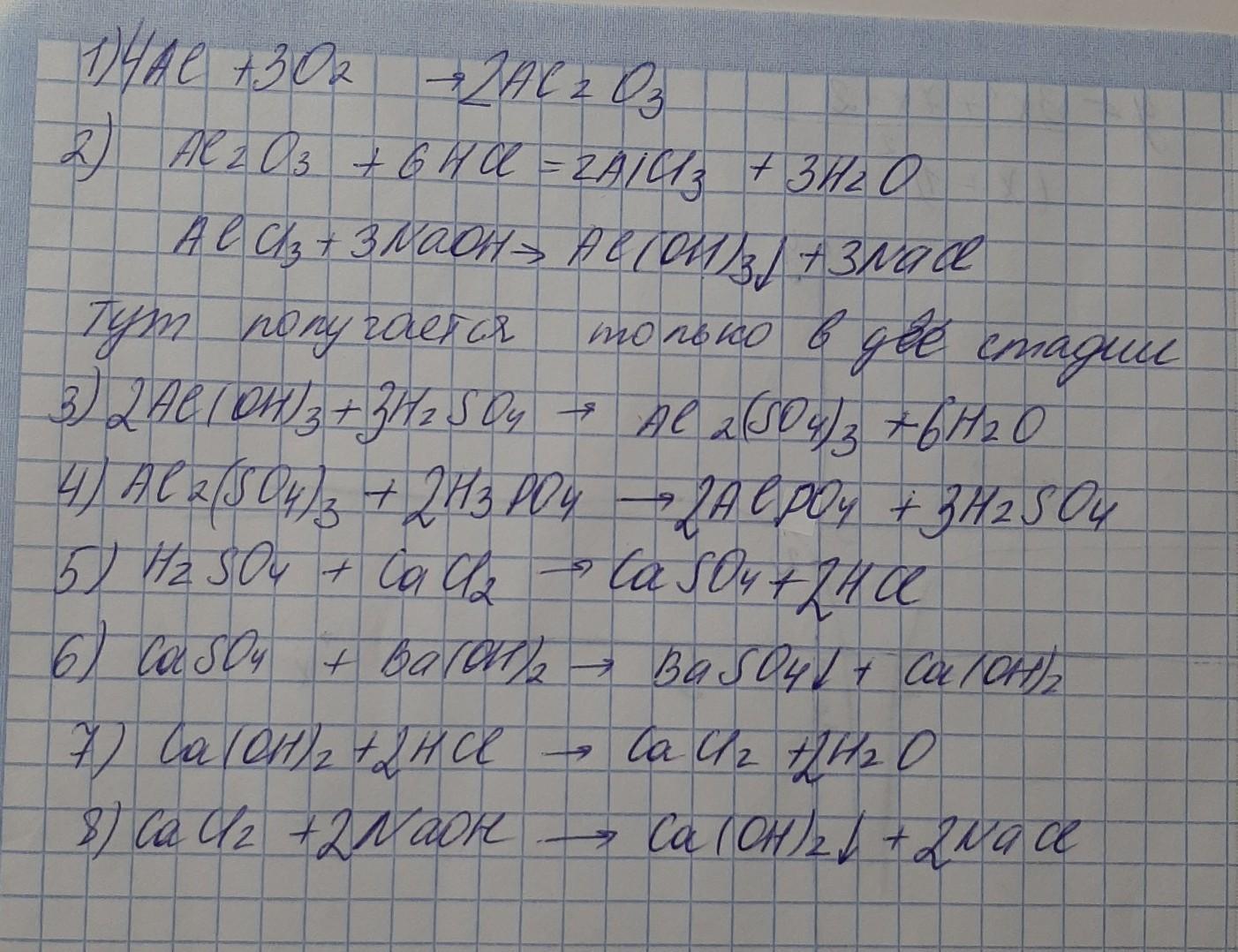 AI -> AI2O3 -> AI (OH)3 -> AI2(SO4)3 -> H2SO4 -> CaSO4 -> Ca(OH)2 -> CaCI2 -> Ca(OH)2