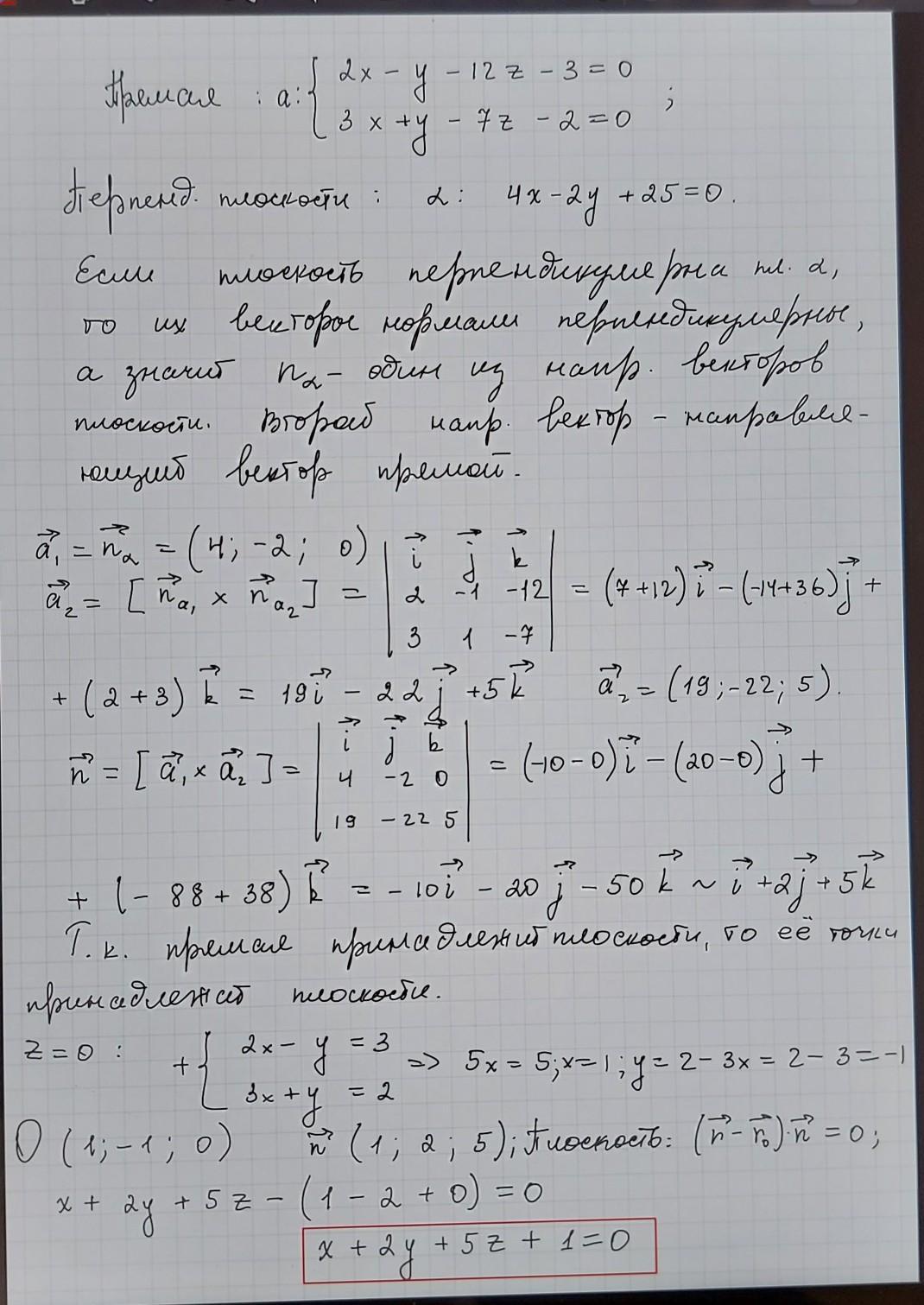 Составить уравнение плоскости, проходящей через линию пересечения плоскостей 2x–y–12z–3 = 0 и 3x+y–7z–2 = 0 перпендикулярно плоскости 4x–2y+25 = 0