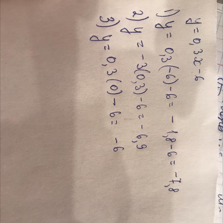 Функция задана формулой y=0,3x-6. Найдите значение функции, соответствующее значению аргумента, равному -6; -3; 0.