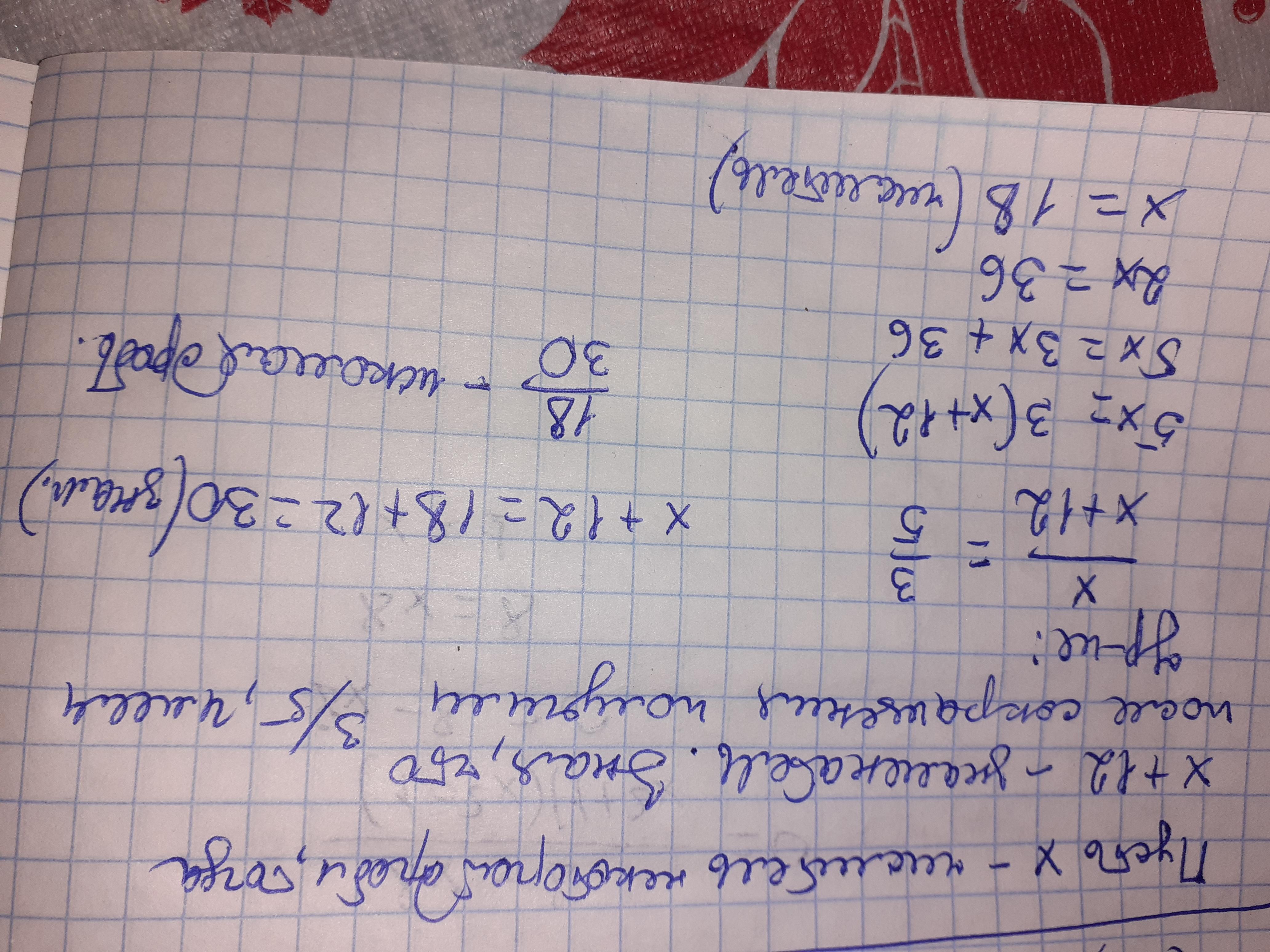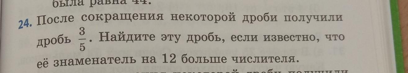 Пусть Х - множитель на которую сократили числитель и знаменатель дроби 3/5. Тогда 3/5 = 3Х/5Х и 5Х = 3Х + 12. Значит 2Х = 12, а Х = 6. Следовательно первоначальная дробь 18/30.