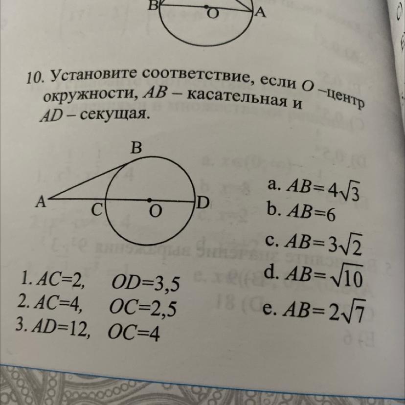 1. АС=2, OD=3,5 ⇒ AO=2+3,5=5,5 OB=3,5 по т. Пифагора АВ=√(5,5²-3,5²)=√18=3√2 - 1 соответствует с;