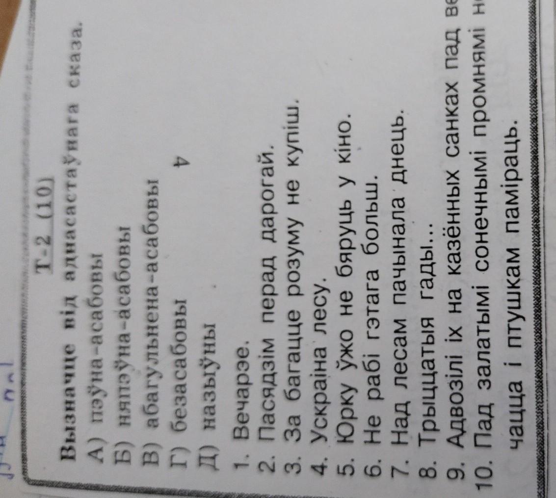 * Т-2 (10) Вызначце від аднасастаўнага сказа. А) пэўна-асабовы Б) няпэўна-асабовы В) абагульнена-асабовы Г) безасабовы д) назыўны 1. Вечарэе. 2. Пасядзім перад дарогай. 3. За багацце розуму не купiш. 4. Ускраіна лесу. 5. Юрку ўжо не бяруць у кіно. 6. Не рабі гэтага больш. 7. Над лесам пачынала днець. 8. Трыццатыя гады... 9. Адвозілі іх на казённых санках пад вечар. 10. Пад залатымі сонечнымі промнямі не хо- чацца і птушкам паміраць, Кахаха...еседкахX