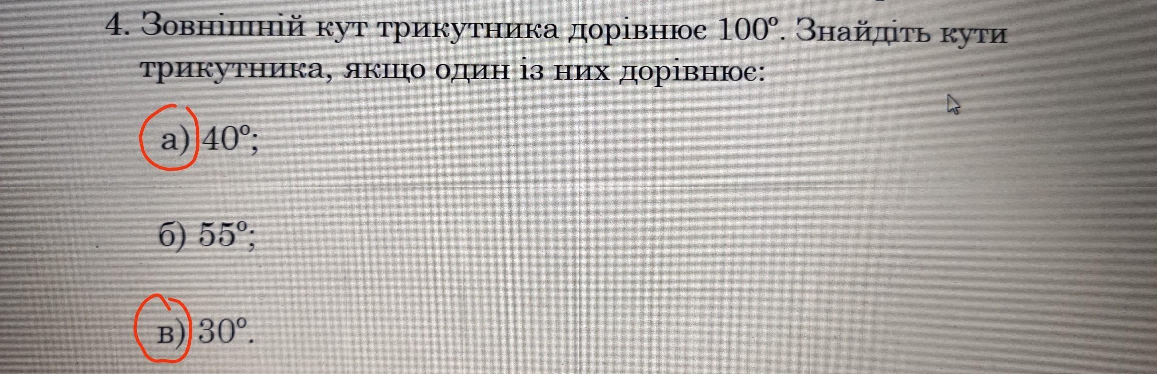 а) Один из углов треугольника = 40° , второй угол нашли и он равен 80°.