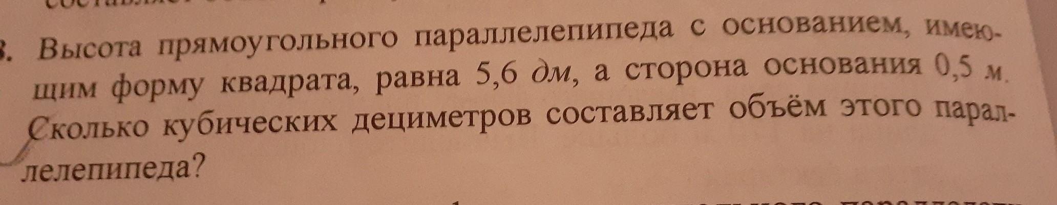 V=a*b*c=5.6*5.6*5=156.8 куб.дм.