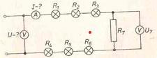 Рассчитайте сопротивление, силу тока и общее напряжение цепи, если R1=R2=R3=R4=R7=10 Ом, R2=R5=R6=20 Ом, U7= 20В