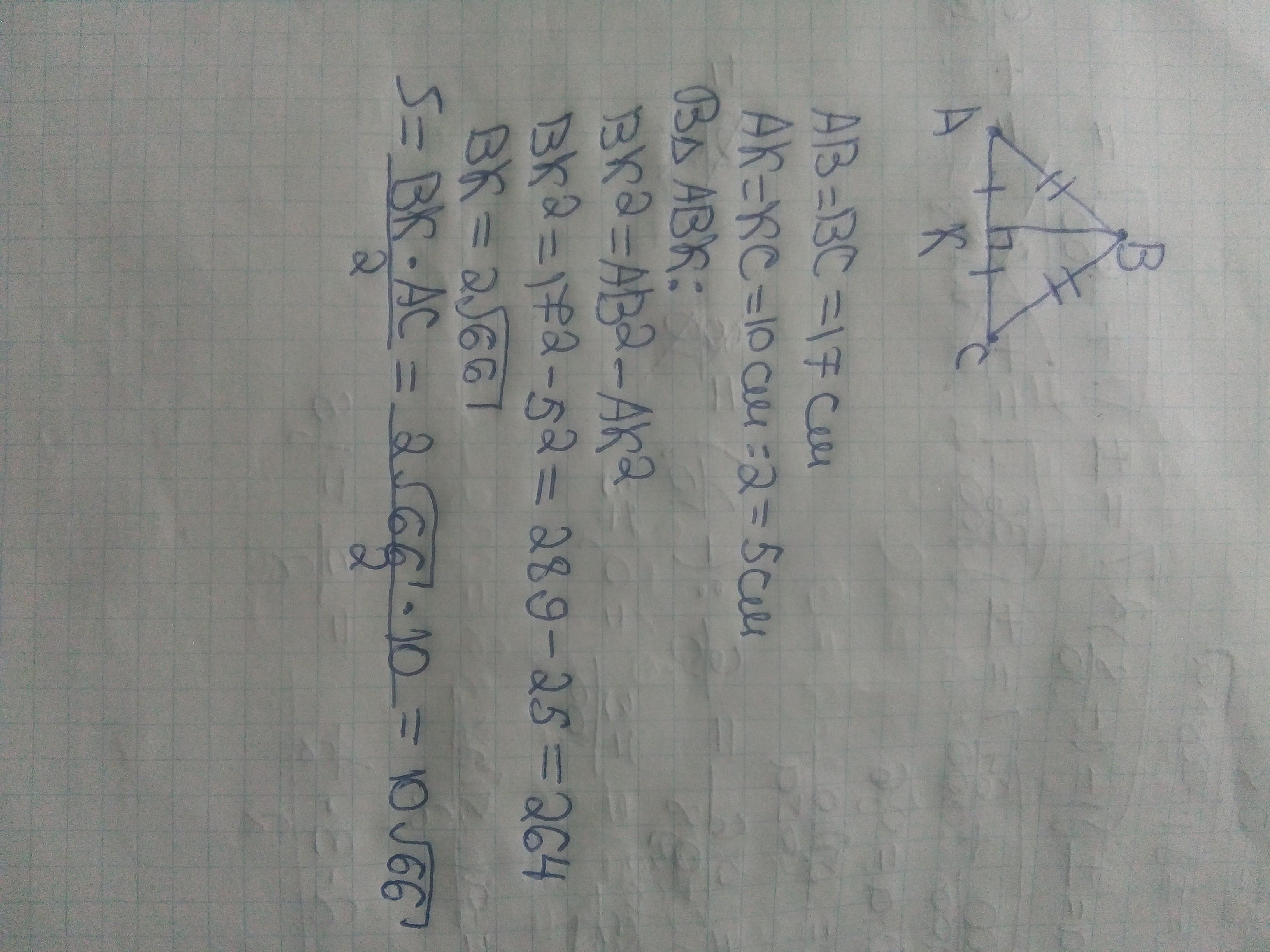5. В равнобедренном треугольнике ABC, BK - медиана. СА = 10см, ВС = 17 см. Найдите площадь треугольника. —