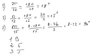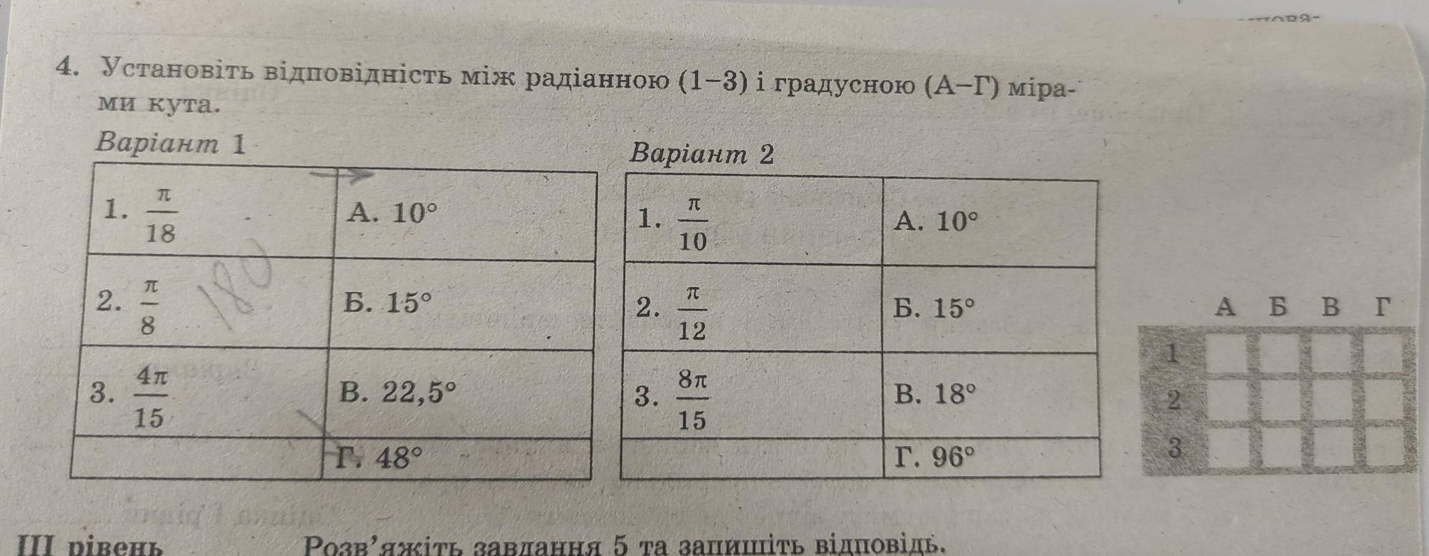 Установіть відповідність між радіанною (1-3) і градусною (А-Г) міра- ми кута.