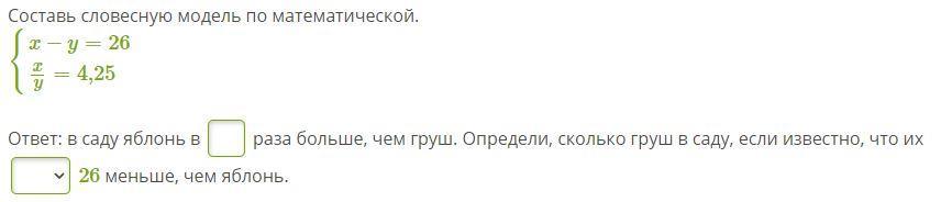 Составление словесной модели по математической (яблони и груши) Ответ: в саду яблонь в раза больше, чем груш. Определи, сколько груш в саду, если известно, что их 26 меньше, чем яблонь.