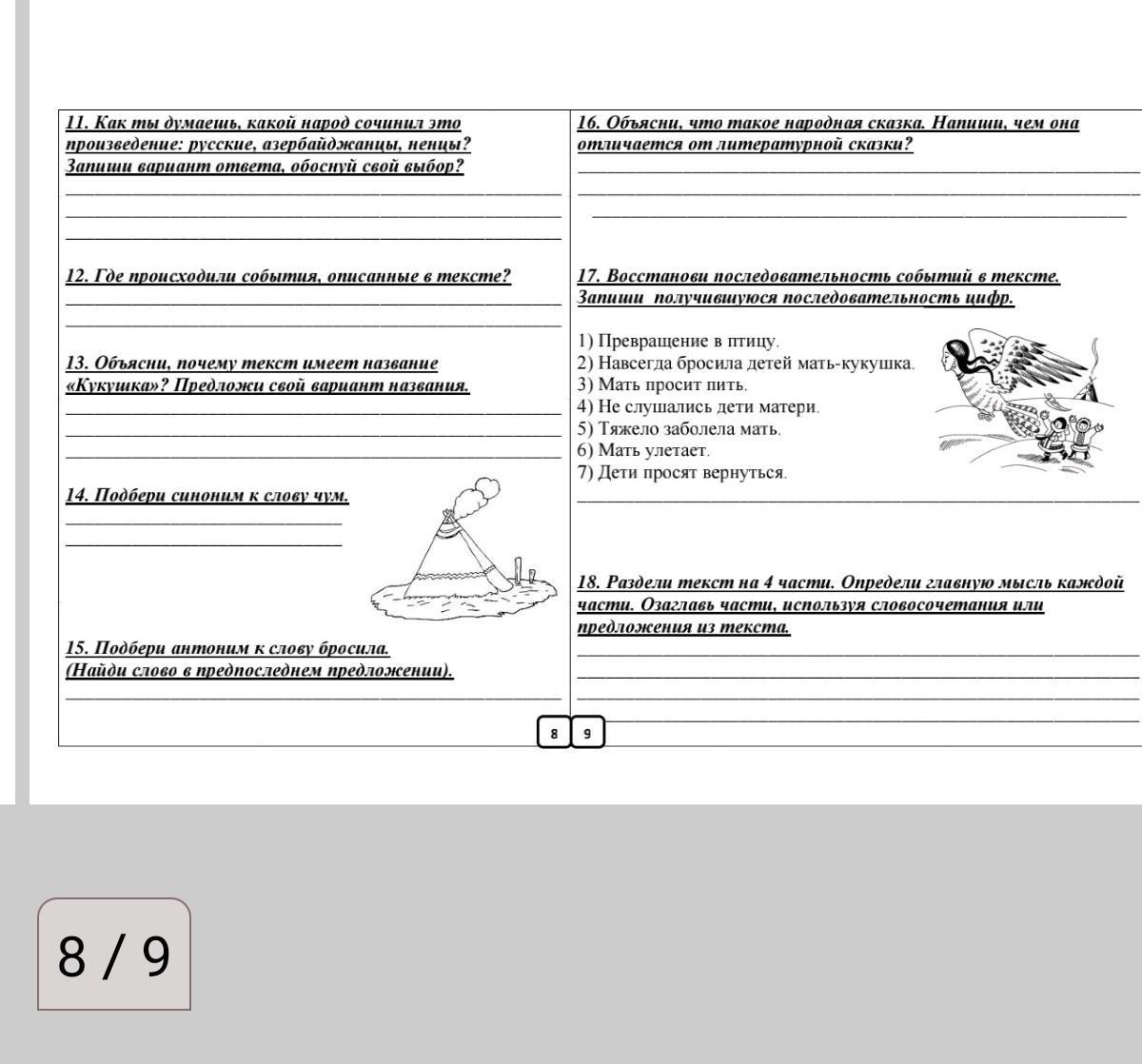 Работа с текстом Прочитай текст Кукушка Жила на земле бедная женщина. Было у неё четверо детей. 6т 20 кг.. He 3 слушались дети матери, Бегали, играли на снегу с утра до вечера. Одежду промочат, а, мать - суши, снегу натащат, 4.Начерт а мать - убери. И рыбу мать на реке сама ловила. Тяжко ей было. А дети ей не помогали. От жизни тяжёлой заболела квадрата. мать. Лежит она и просит, детей зовёт: «Детки, пересохло горло, принесите мне водички». Не один, не два раза просила мать. Не идут дети за водой Наконец захотел старший есть, заглянул в чум, а мать посреди чума стоит, малицу надевает. И вдруг малица перьями покрылась. Берёт мать доску, на которой шкуру 5. Вычис скоблят, а доска та хвостом птичьим становится. Напёрсток 18370 + железный ей клювом стал. Вместо рук крылья выросли. Обернулась мать птицей и вылетела из чума. - Братья, смотрите, смотрите: улетает наша мать птицей! - закричал старший сын, Тут побежали дети за матерью: - Мама, мы тебе водички принесли. Ку-ку, ку-ку, ку-ку! Поздно, сынок, не вернусь я, 6.Запии Так бежали за матерью дети много дней и ночей по камням, 6 сот. по болотам, по кочкам. Ноги себе в кровь изранили. Где 3 ед. II побегут, там красный след остаётся. Навсегда бросила детей мать-кукушка. И с тех пор не вьёт себе кукушка гнезда, не растит сама своих детей, а по тундре с той поры красный мох