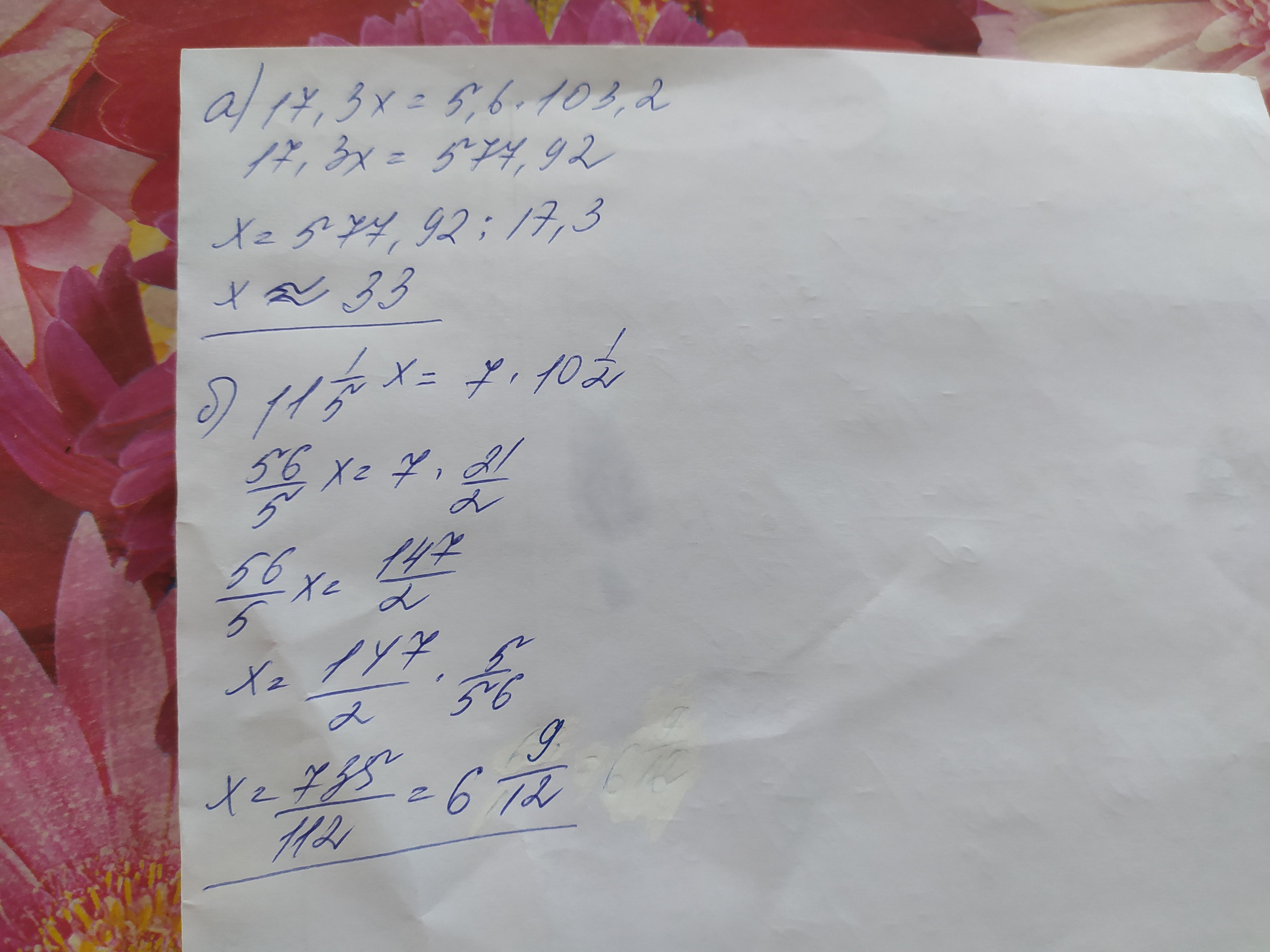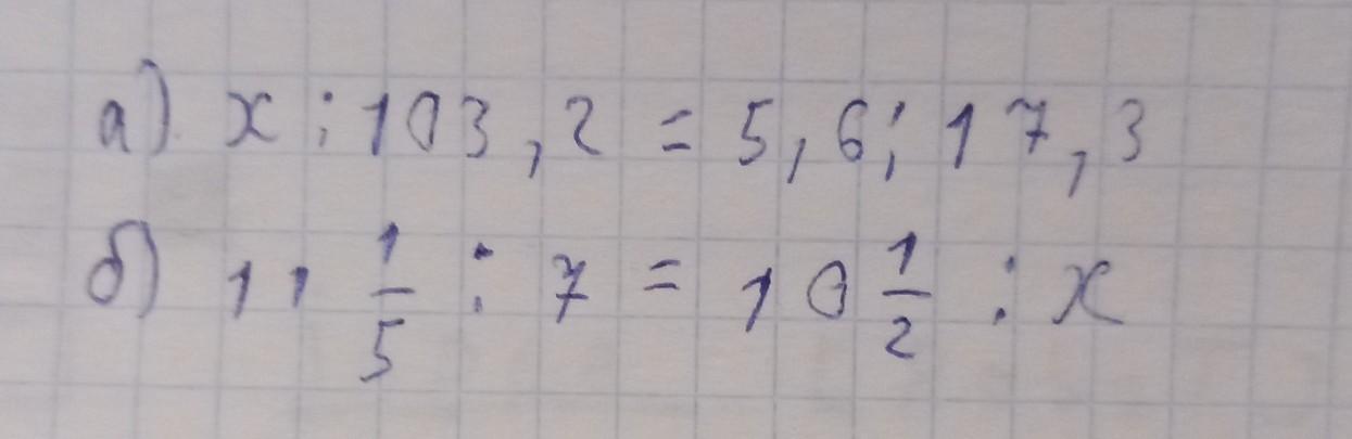 б), 11 1/5 : 7 = 10 1/2 : х