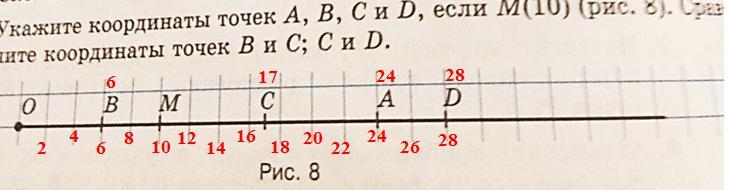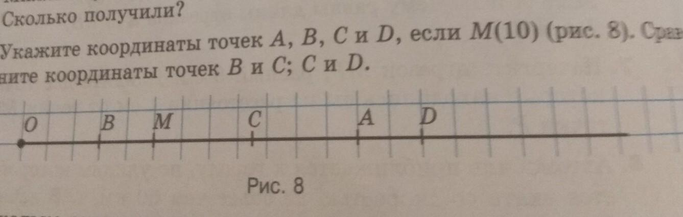 13. Укажите координаты точек A, B, C и D, если M(10) (рис. 8). Сравните координаты точек В и C; C и D.