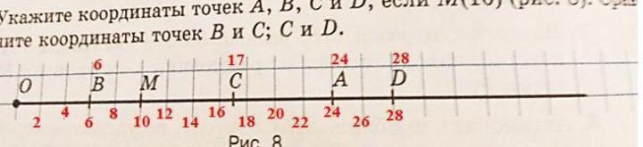 Как видно из рисунка, от начало координат, то есть с 0, до точки М находится 5 клеток. Отсюда, каждая клетка равна 10:5 = 2 меркам размерности. Поэтому можем написать координатные значения (см. рисунок). Тогда координаты точек A(24), B(6), C(17) и D(28).