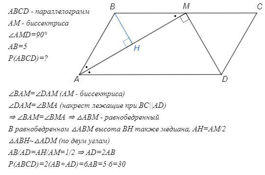 В параллелограмме ABCD биссектриса угла А, равного 60°, пересекает сторону ВС в точке М. Отрезки АМ и DM перпендикулярны. Найдите периметр параллелограмма, если AB = 5. Запишите решение и ответ.