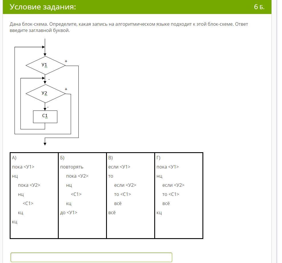 Дана блок-схема. Определите, какая запись на алгоритмическом языке подходит к этой блок-схеме. Ответ введите заглавной буквой.
