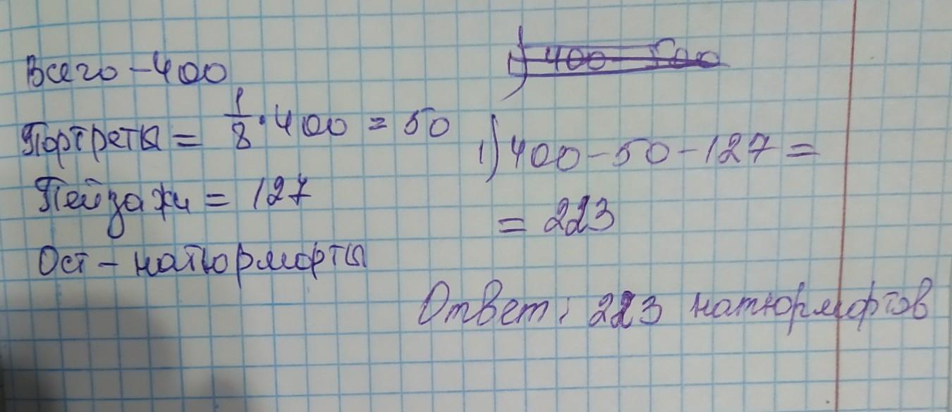 художник нарисовал 400 картин 1/8 составляет портреты 127 пейзажи а остальные натюрморты сколько натюрмортов был нарисовано
