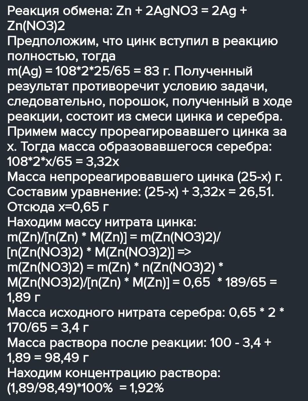 25 г порошка цинка поместили в 100 г водного раствора нитрата серебра(І). После окончания реакции порошок отфильтровали, высушили и взвесили; масса порошка составила 26,29 г. Определите массовую долю соли в исходном растворе.