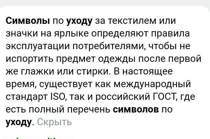 Ответ:Символы по уходу за текстильными изделиями используются для маркировки изделий из текстильных материалов. Они определяют правила обработки изделий для их правильной эксплуатации, а также предотвращения их преждевременного износа и порчи.