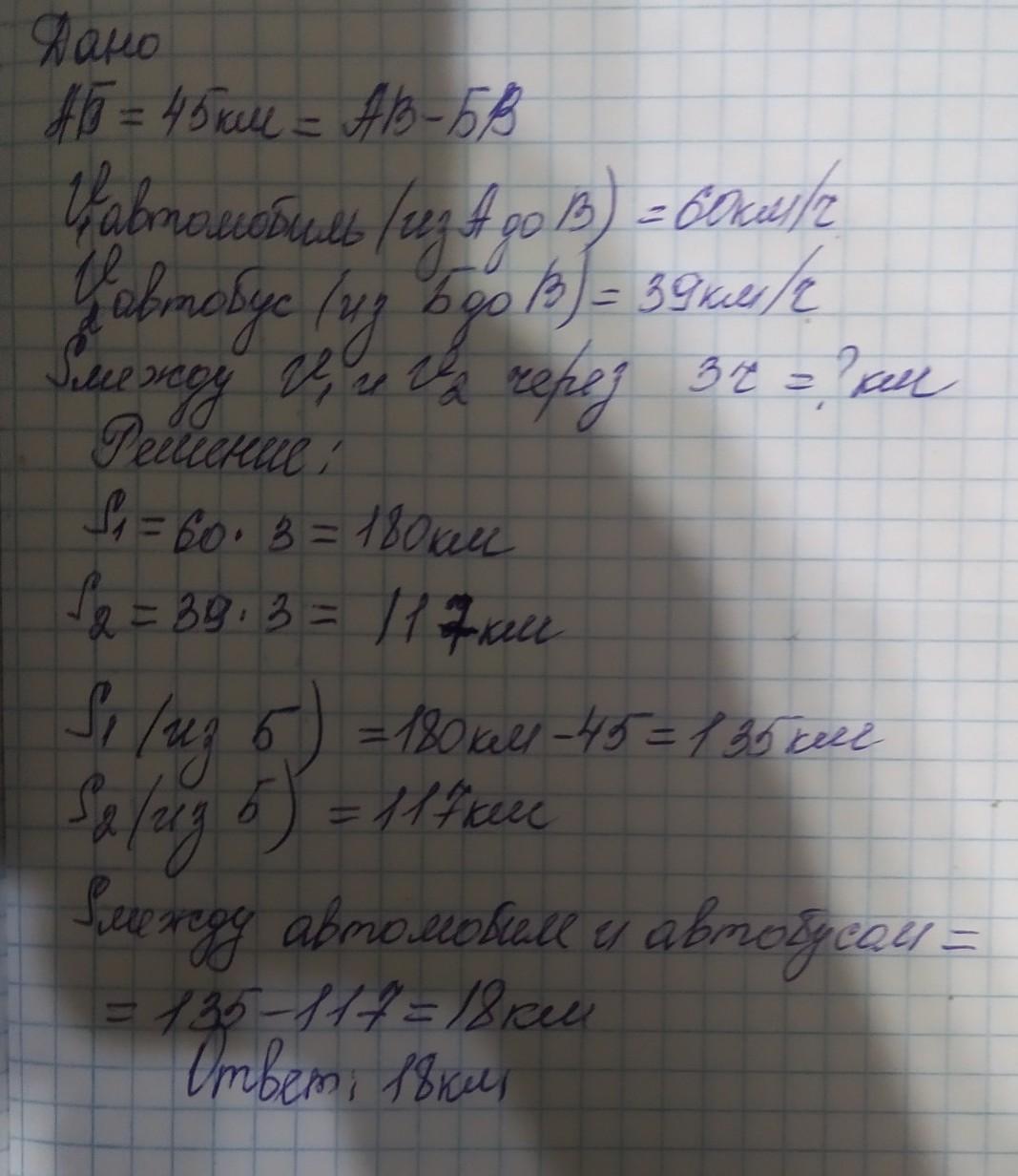 Расстояние между городами А и Б равно 45 км.Одновременно в сторону В из города А выехал автомобиль,а из города Б -автобус.Скорость автобуса равна 39км/ч,а автомобиля 60км/ч.Какое расстояние будет между автобусом и автомобилем чрез 3 часа после начала движения?Ответ дай в километрах.